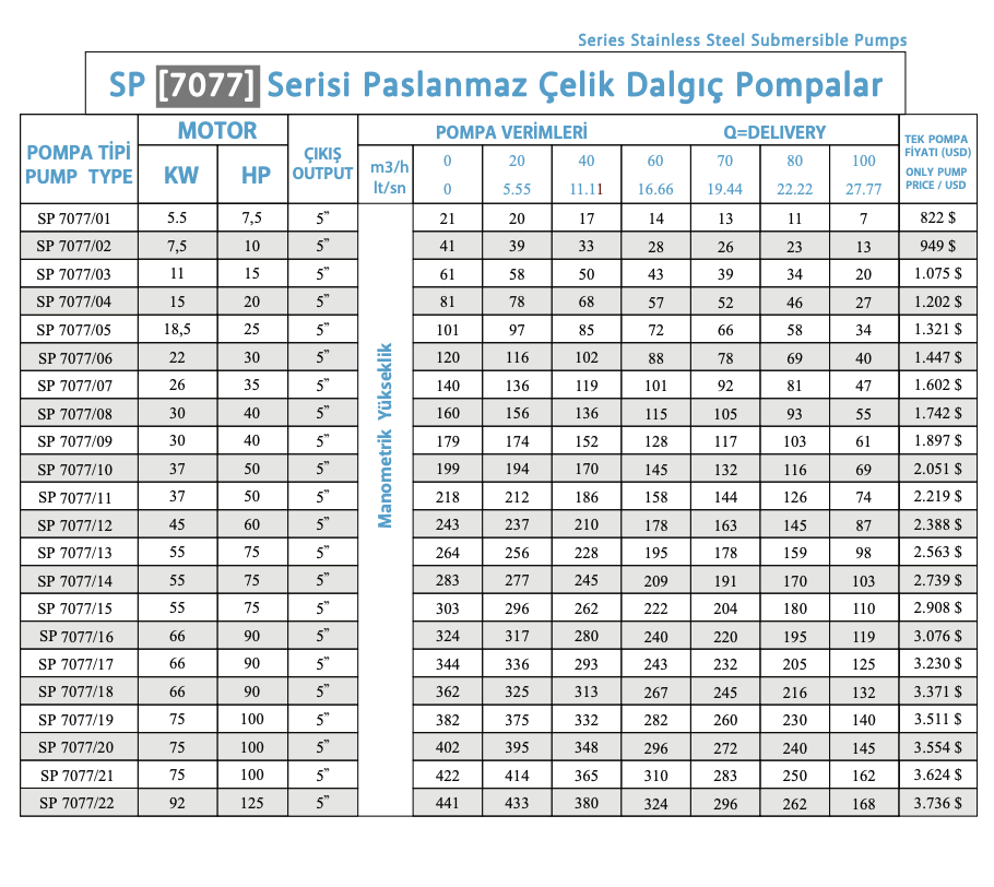 SP [7077] Serisi Paslanmaz Çelik Dalgıç Pompalar